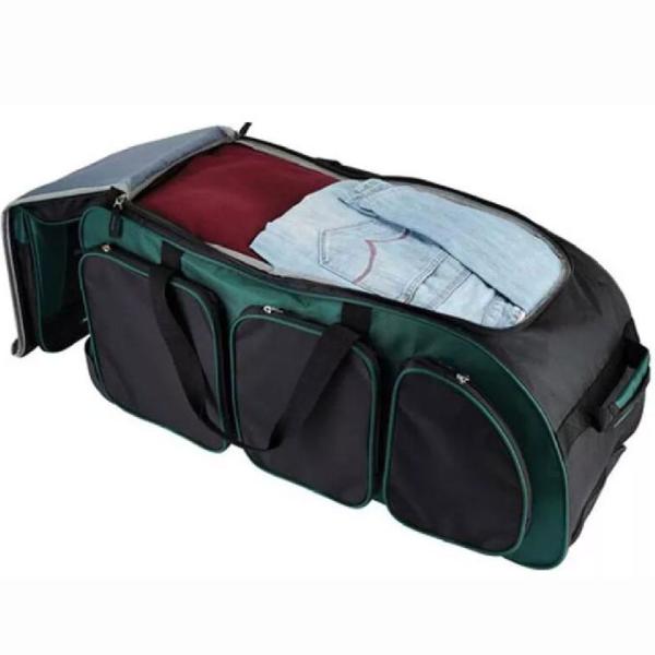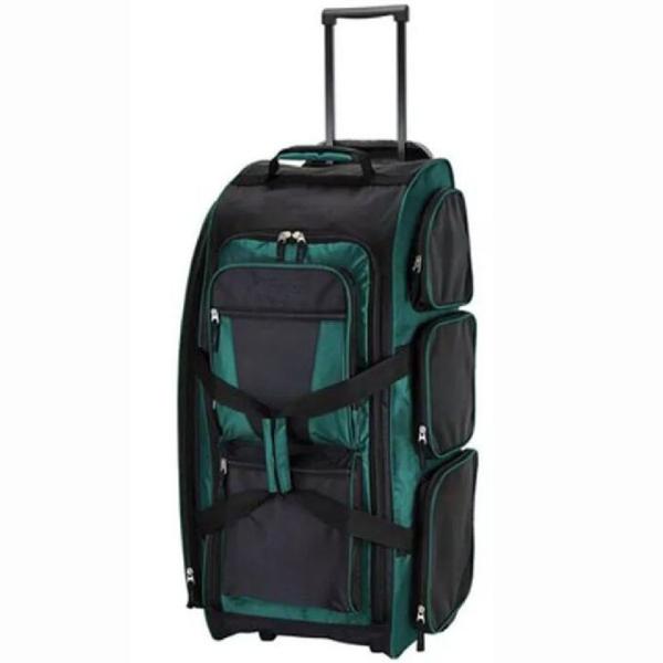 Multi-Pocket Duffel Rolling Trolley Bag is made from durable polyester and features a two-tone design with lightweight and sturdy construction, padded top and rear grip handles, protective bottom guards for added durability, and triple in-line blade wheels for easy mobility. Lightweight yet durable Polyester construction Retractable telescopic handle Large U-Shaped zippered top opening for easy packing Spacious main compartment Padded top and rear grip carry handles for comfortable lifting Extra large zippered accessory pockets Protective bottom guards to minimize damage during travel Deluxe triple in-line blade wheel system for smooth rolling.